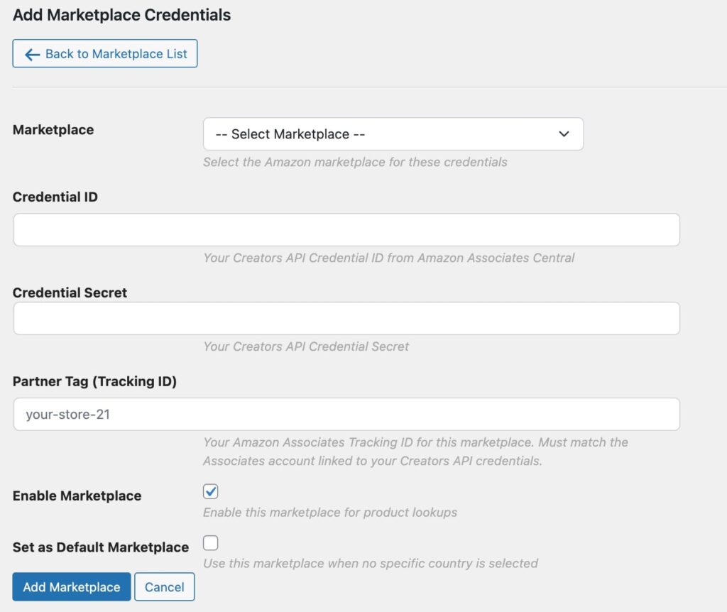 Unlike the global PA API credentials you’re used to, Amazon’s Creators API credentials are tied to specific marketplaces. If you promote products from multiple Amazon stores (e.g., amazon.de, amazon.com, amazon.co.uk), you need separate Creators API credentials for each.