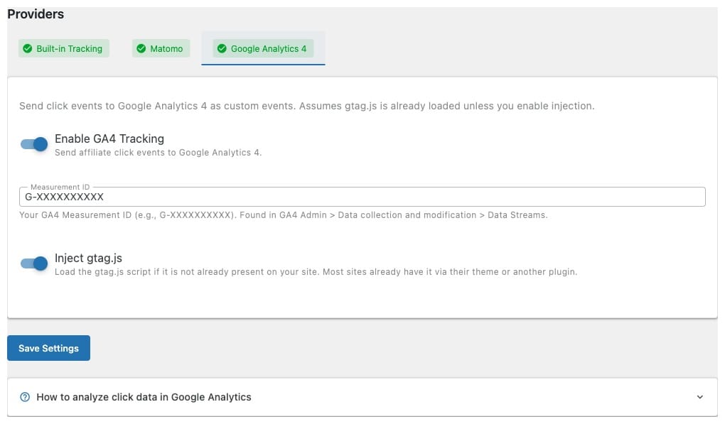 Choose Built-in, Matomo, GA4 — or all three. Each provider is configured independently.
